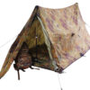Классическая палатка-бивуак с тамбуром для снаряжения. Устанавливается как при помощи двух трекинговых палок, так и любых срубленных в лесу стоек. В случае сильного дождя или снега можно забраться в палатку и поставить рюкзаки в распор.