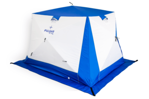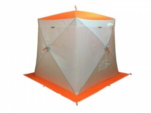 - Зимние — выбор для тех, кто отправляется на рыбалку в холодное время года. Такие палатки фиксируются на ледовой поверхности и способны создавать комфортные условия рыбаку. Они имеют форму куба или полусферы. В зимних палатках чаще всего отсутствует напольное покрытие, но, в некоторых случаях, есть напольная подстилка с прорезями для лунок.